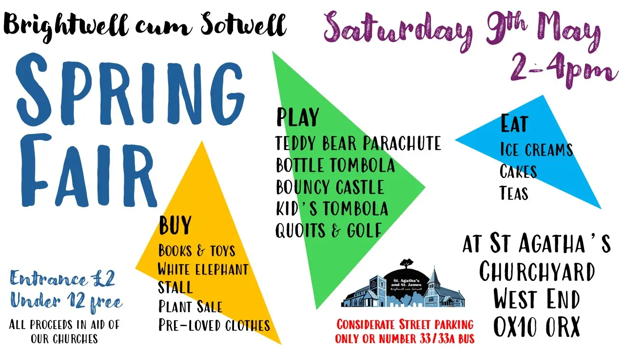 Come and enjoy a traditional Spring Fair in glorious Brightwell cum Sotwell. There will be the famous White Elephant Stall (for vintage favourites and bargains), plus a huge selection of books and wonderful children’s toys. Test your skills at golf and quoits, try your luck at the bottle tombola or buy village-grown plants. After all that energy on the bouncy castle, why not sit down with an ice cream, a cup of tea and homemade cakes and watch your adventurous teddy bear sail down on a parachute or zip wire from the top of the church tower. Leave your devices at home and have fun! Bring coins for pocket money and cards for everything else. The essential addition? Glorious spring sunshine. Entrance £2 adults; under 12 free. All proceeds go to our churches.