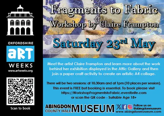 Participants will work with a variety of papers, card and coloured pens. This paper craft activity is similar to the design work of Claire Frampton when she began working with fragment shapes as inspiration for textile designs. Participants are advised to bring a folder to take their work home. Participants are encouraged to post photographs of their work on social media and tag Abingdon Museum.