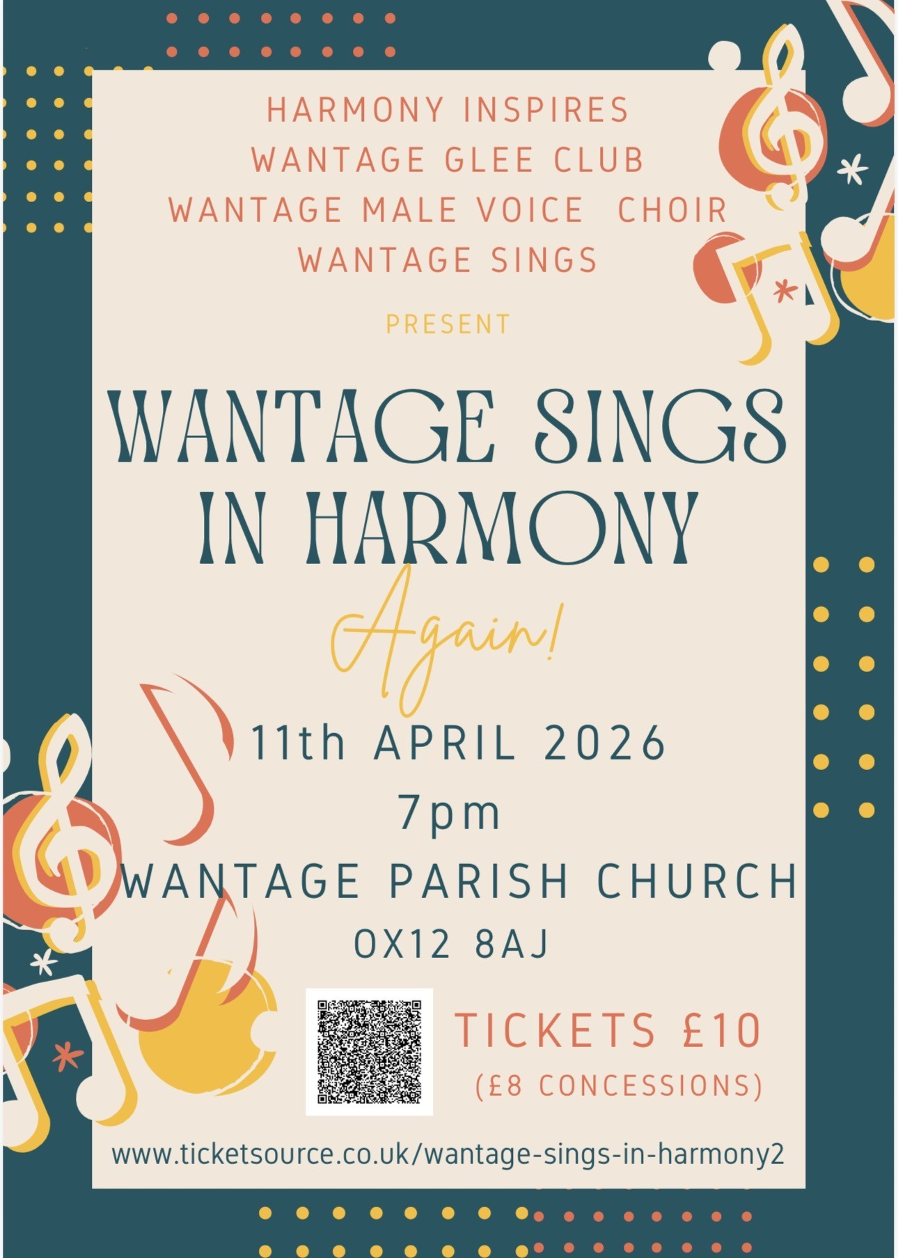 Saturday 11th April 2026 🕖 7:00pm 📍 Wantage Parish Church, OX12 8AJ 🎟️ Tickets £10 (£8 concessions) https://www.ticketsource.co.uk/wantage-sings-in-harmony2 ☕ Refreshments will be available for purchase and there will also be a raffle! Come and support local music-making and enjoy a wonderful evening of harmony!